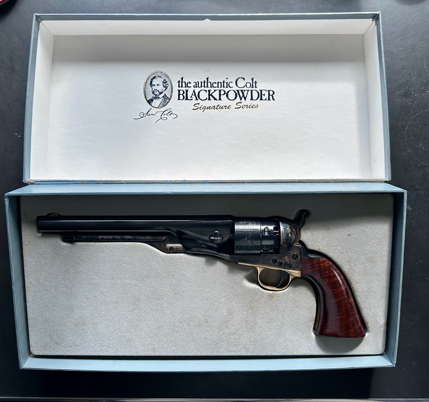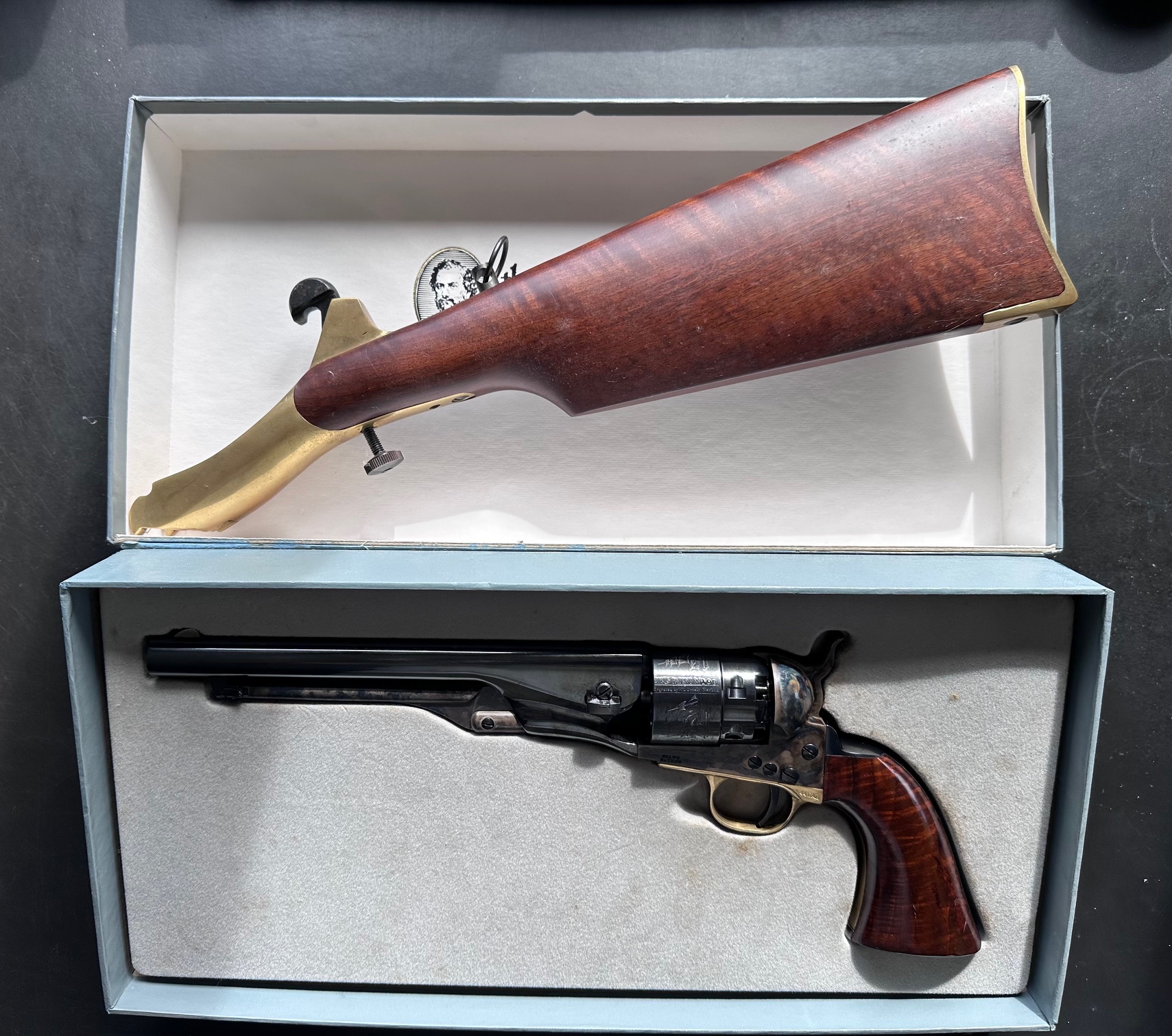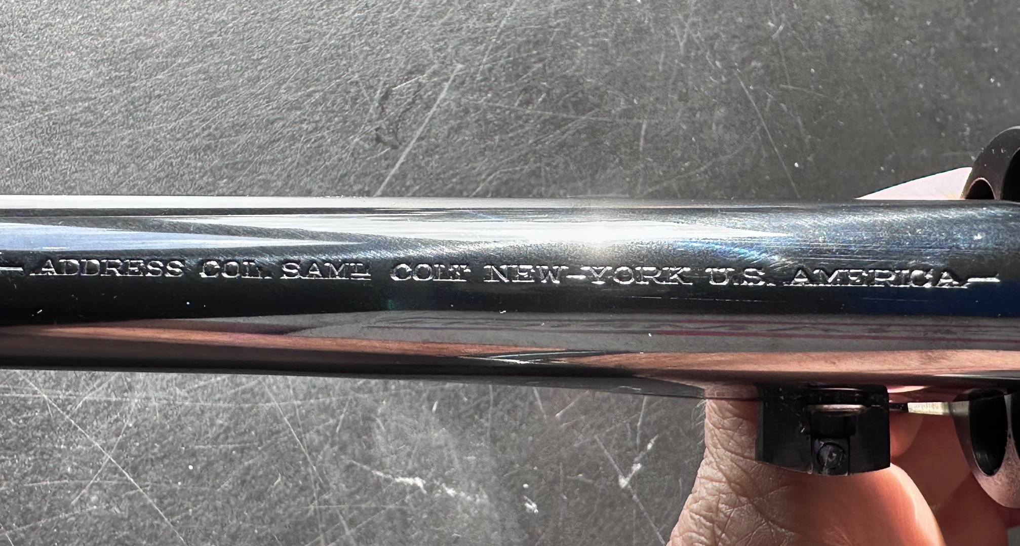 Original Colt Navy .44 2nd generation revolver with engraved stock and box.